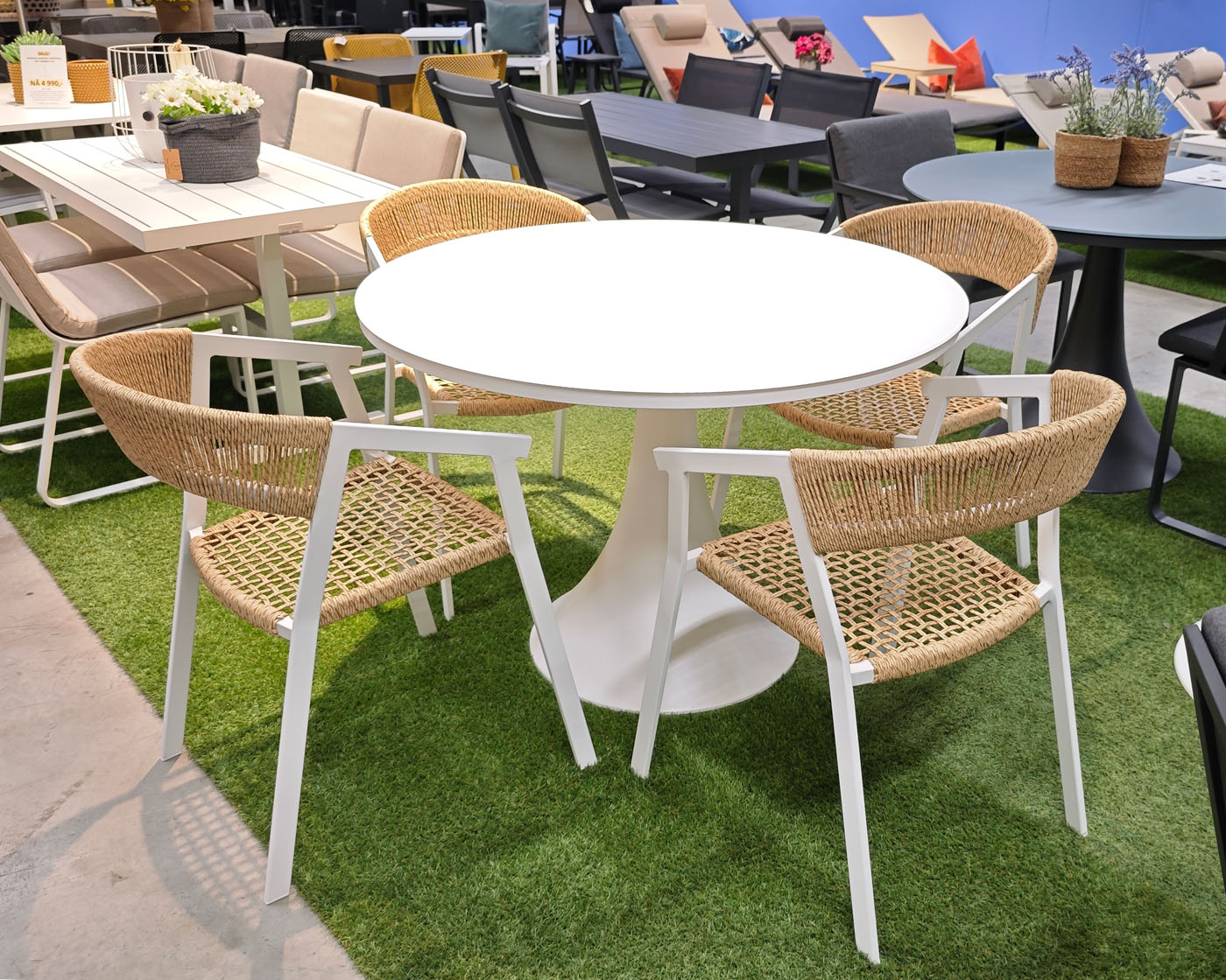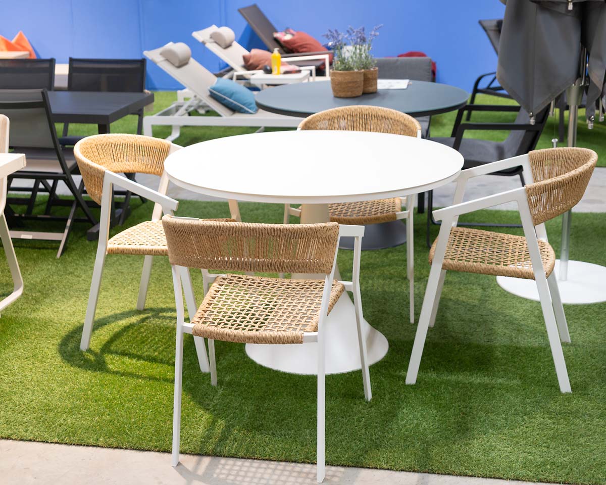 Gardenart rundt spisebord 110 cm med fire stoler i aluminium og rotting. 100521pakke
