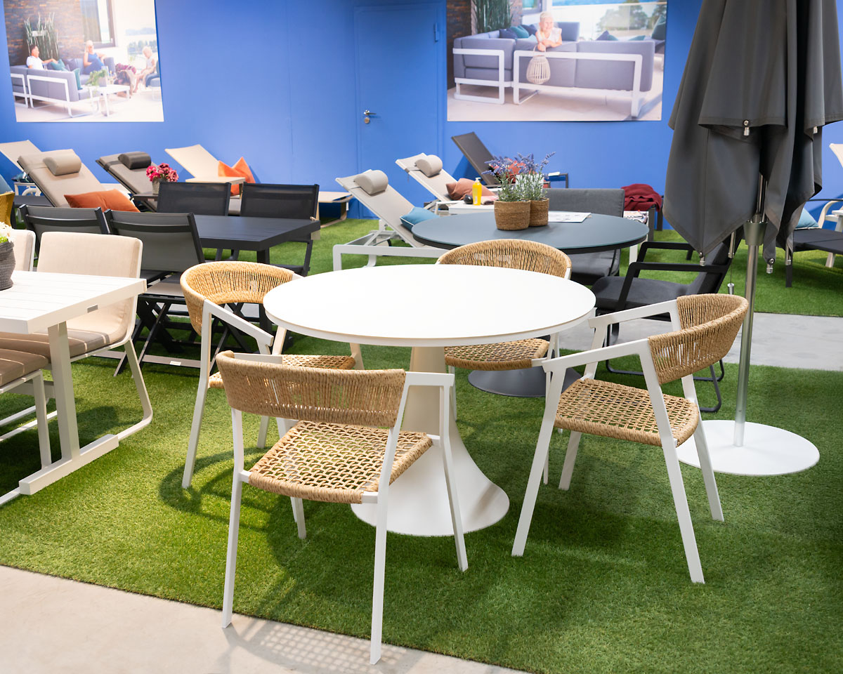 Utstilling Gardenart treseter i hvit aluminium med lysgrå puter (100452)