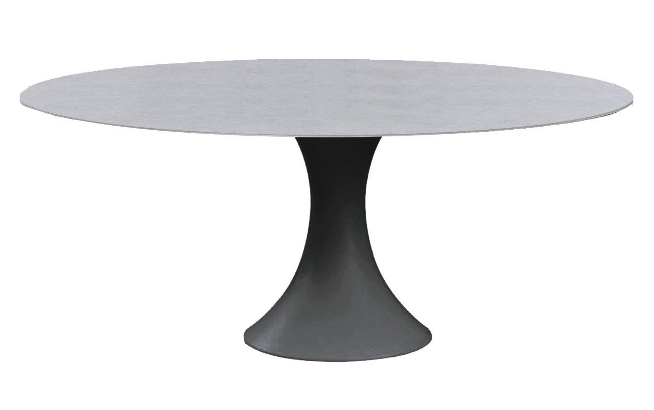 Rundt spisebord i sort aluminium med 6 mm tykk grå steinplate i betonglook. Diameter 150 cm. Høyde 75 cm.