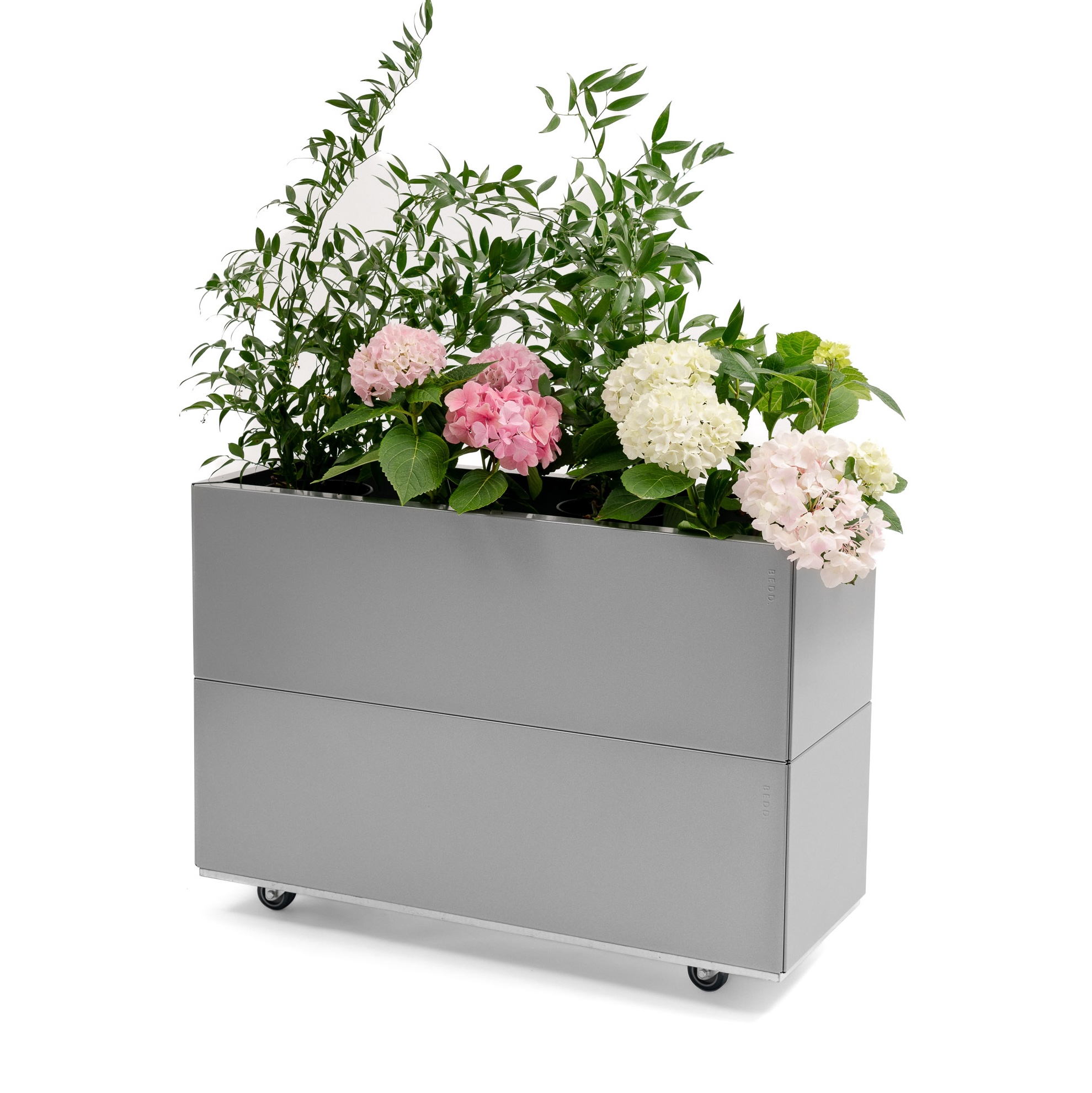 En lekker plantekasse til balkongen eller terrassen. Perfekt for urter og dekorativ med sesongens blomster. Produktet leveres som en pakkeløsning med fire paneler, bunn, hjul og skruer for montering. BEDD er et nytt system for å bygge plantekasser i stål til balkong, terrasse og hage. Det er et modulært system som kan bygges slik du selv ønsker. BEDD er flatpakket for enkel lagring og transport. Det er en enkel montering uten bruk av verktøy – ENKELT OG BÆREKRAFTIG!