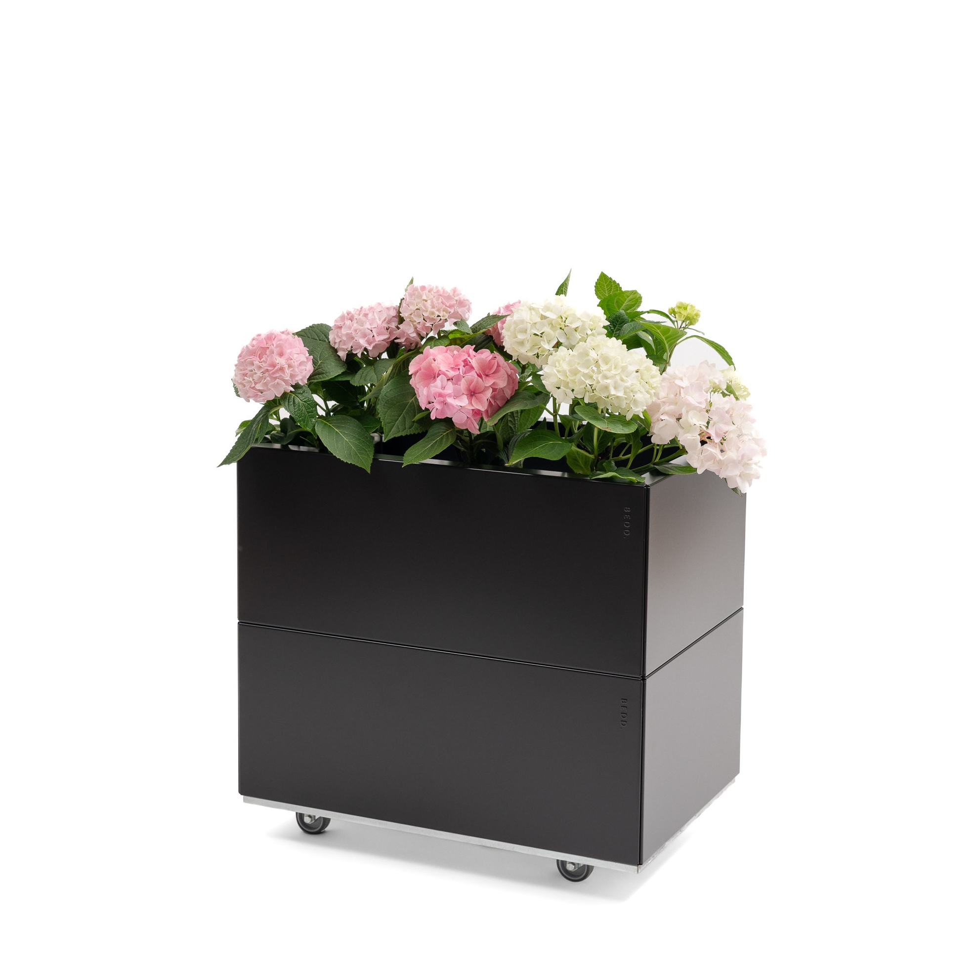 En lekker plantekasse til balkongen eller terrassen. Perfekt for urter og dekorativ med sesongens blomster. Produktet leveres som en pakkeløsning med fire paneler, bunn, hjul og skruer for montering. BEDD er et nytt system for å bygge plantekasser i stål til balkong, terrasse og hage. Det er et modulært system som kan bygges slik du selv ønsker. BEDD er flatpakket for enkel lagring og transport. Det er en enkel montering uten bruk av verktøy – ENKELT OG BÆREKRAFTIG!