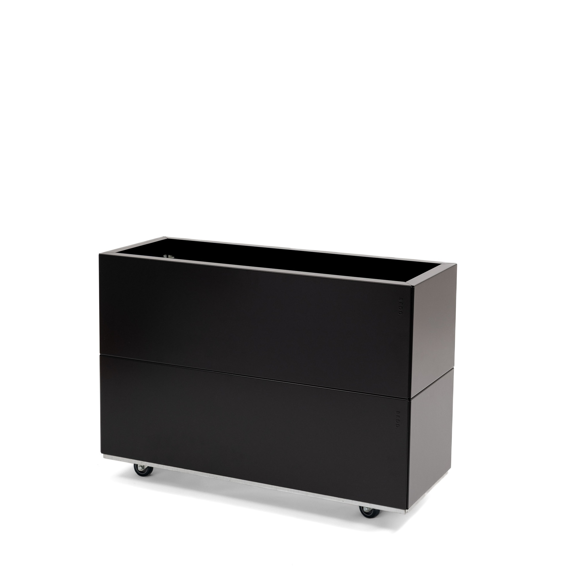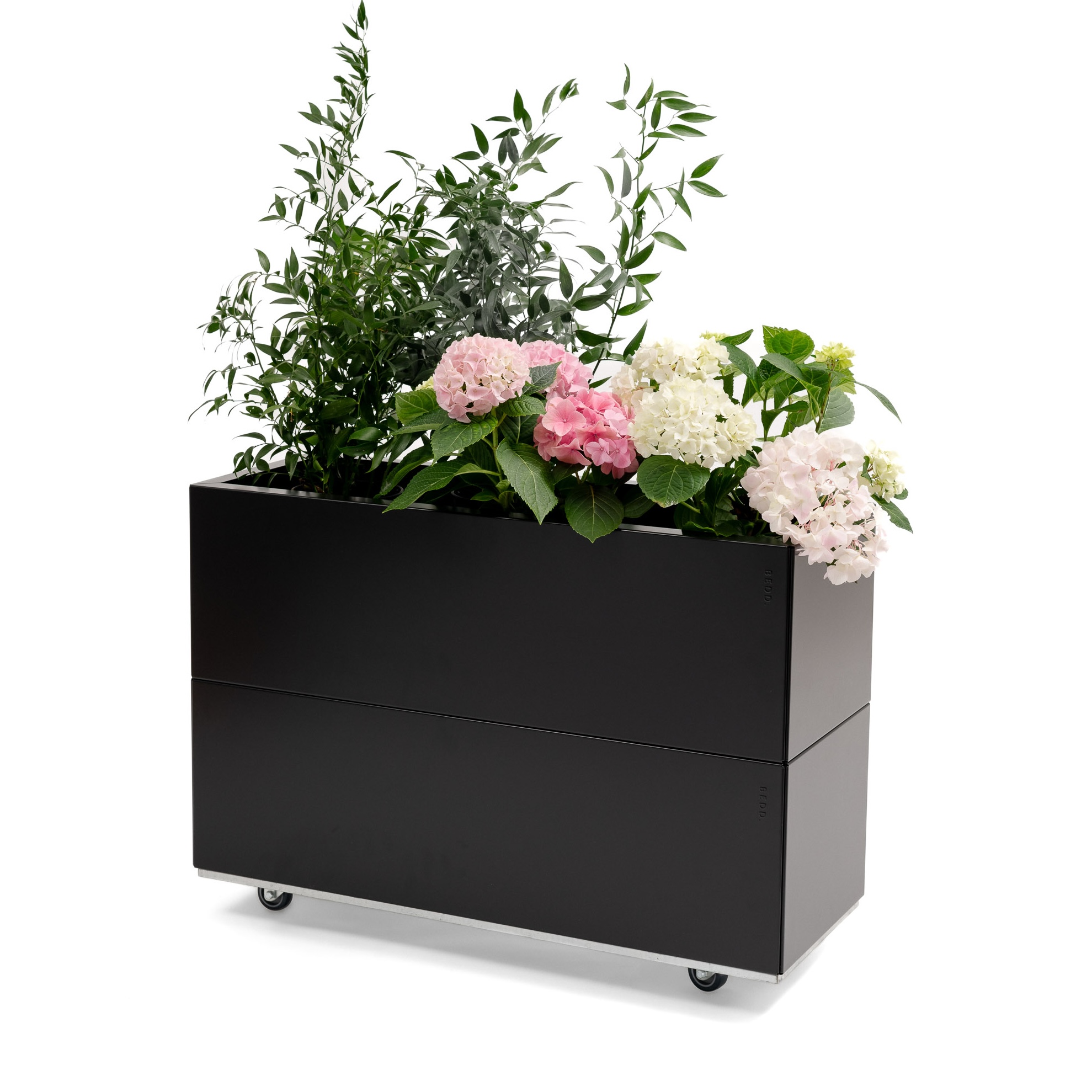 En lekker plantekasse til balkongen eller terrassen. Perfekt for urter og dekorativ med sesongens blomster. Produktet leveres som en pakkeløsning med fire paneler, bunn, hjul og skruer for montering. BEDD er et nytt system for å bygge plantekasser i stål til balkong, terrasse og hage. Det er et modulært system som kan bygges slik du selv ønsker. BEDD er flatpakket for enkel lagring og transport. Det er en enkel montering uten bruk av verktøy – ENKELT OG BÆREKRAFTIG!