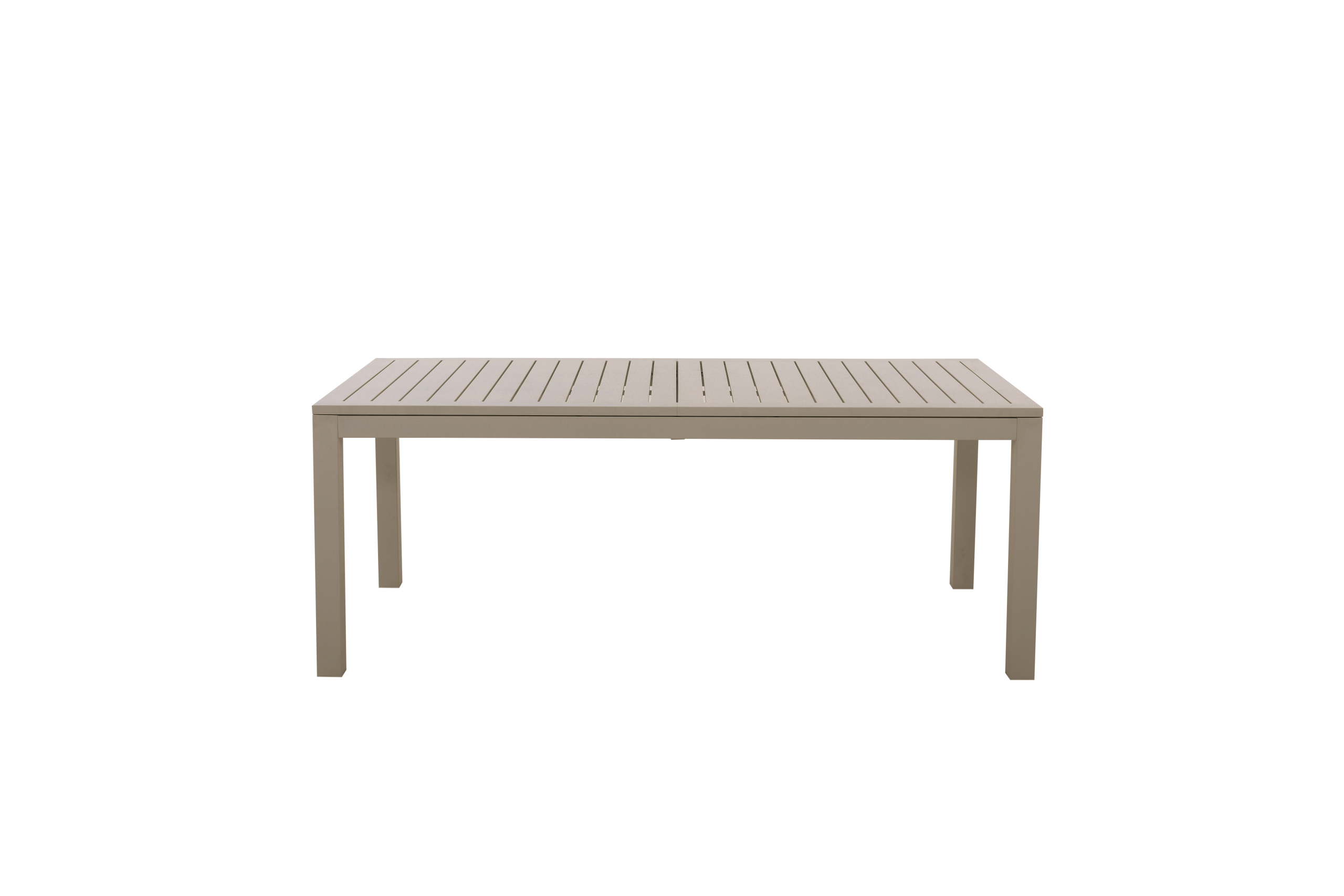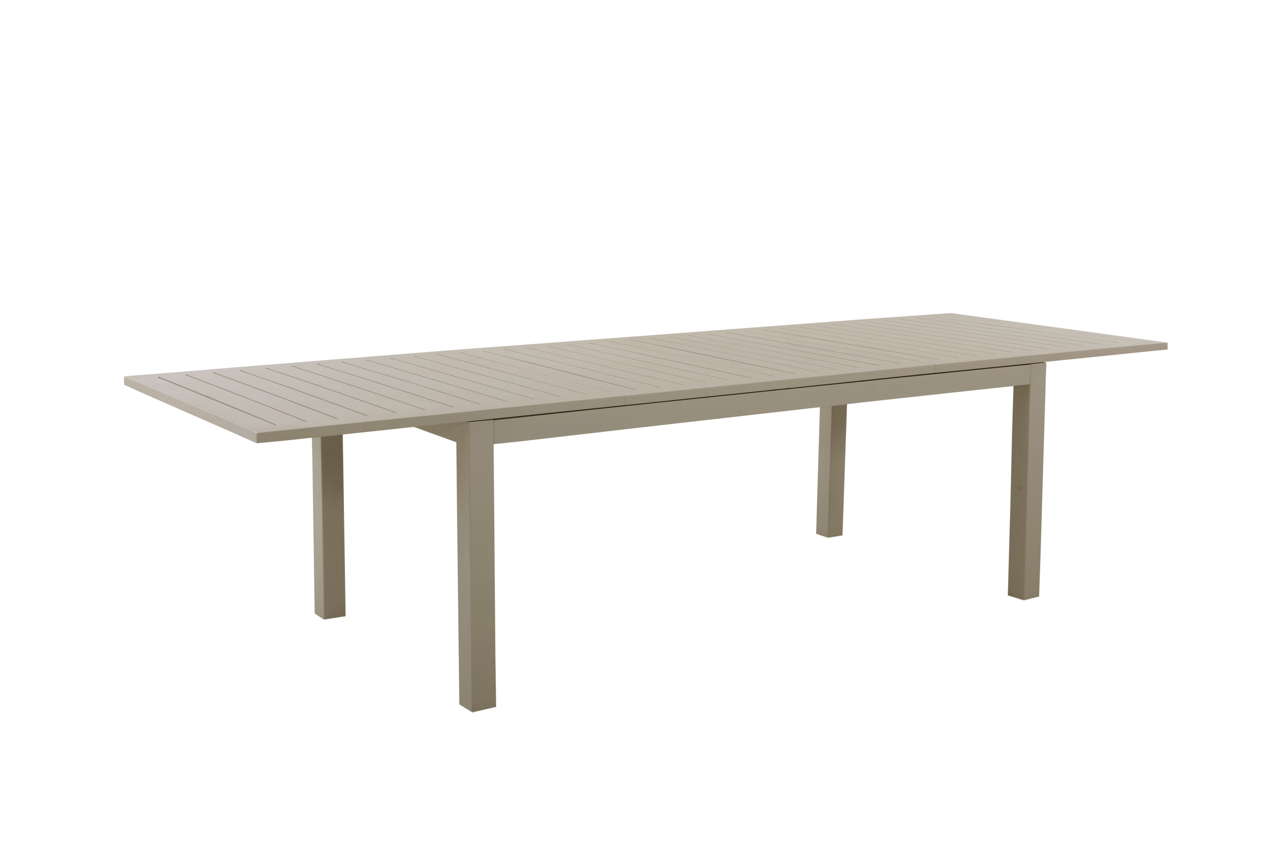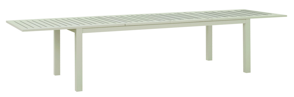 Stort spisebord i aluminium med to ileggsplater på til sammen 107 cm. Hver plate er på 53,5 cm og man kan velge å bare benytte den ene ileggsplaten slik at bordet da blir 251,50 cm langt.