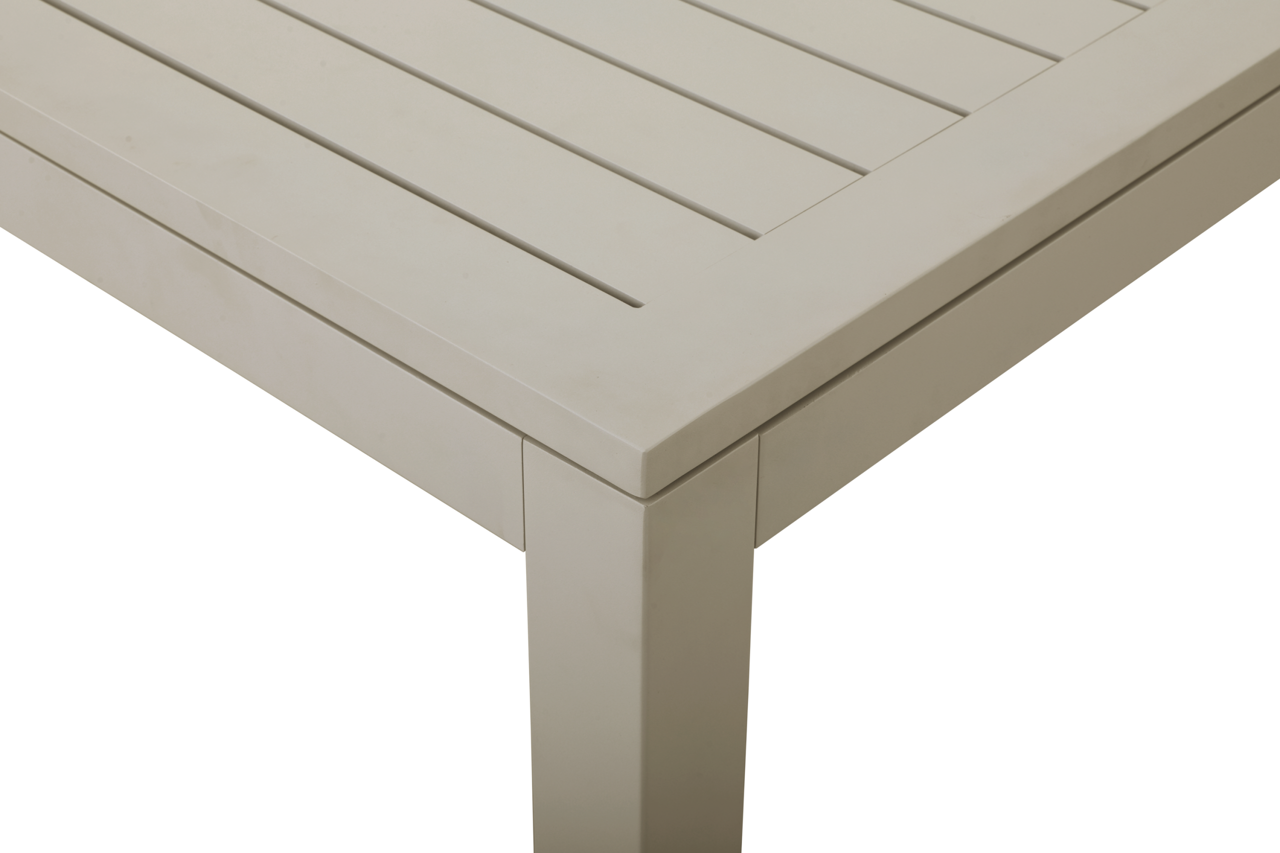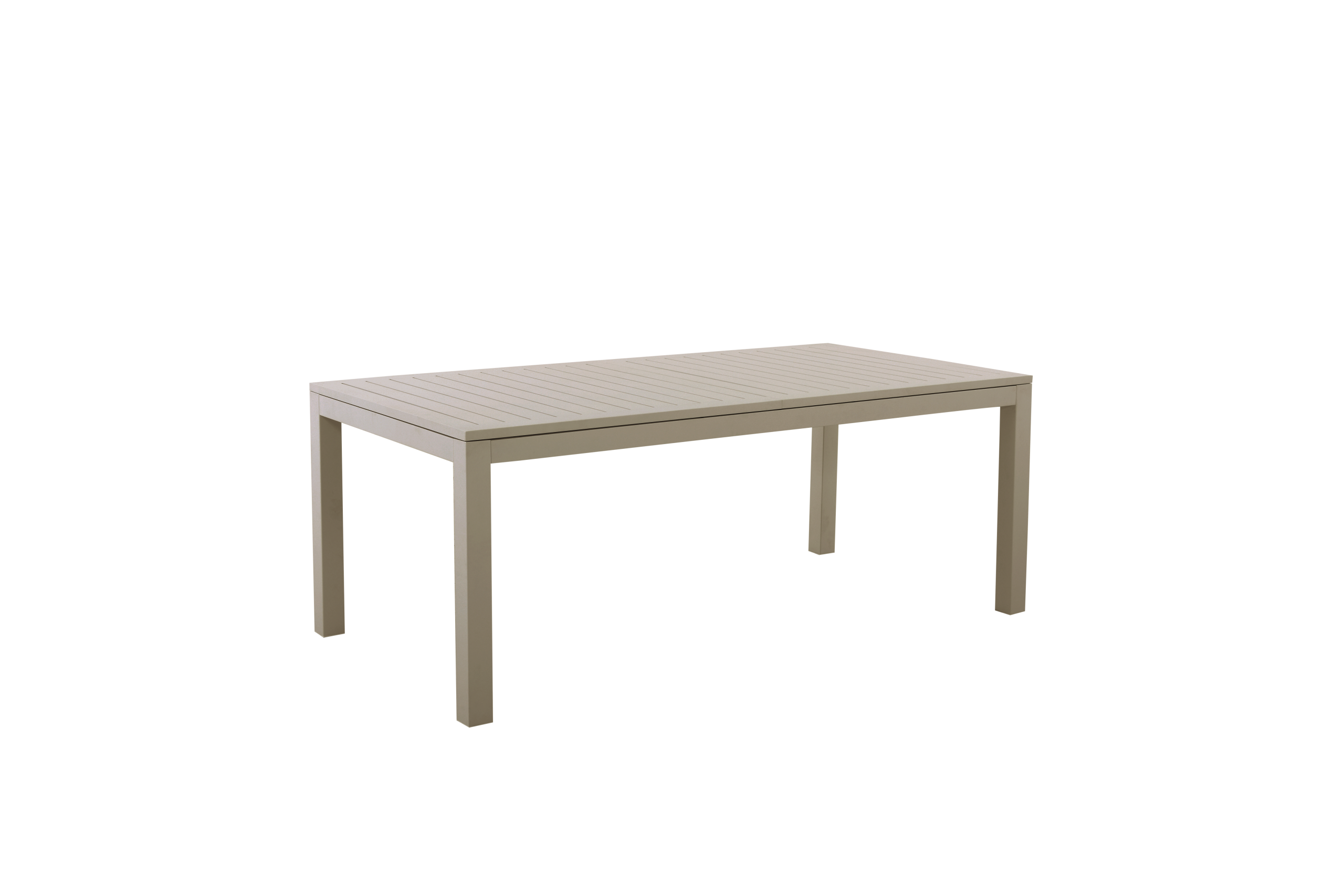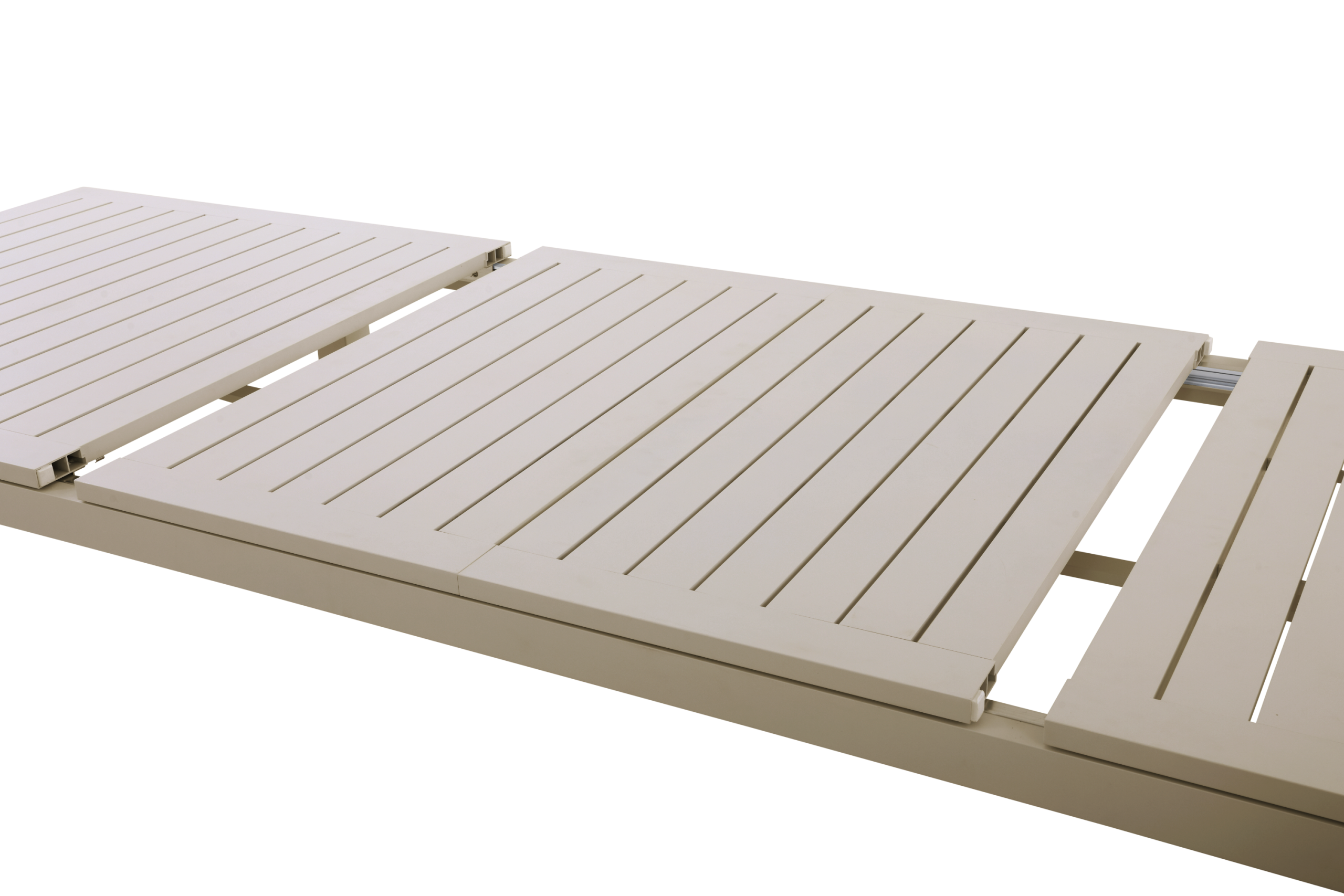 Stort spisebord i aluminium med to ileggsplater på til sammen 107 cm. Hver plate er på 53,5 cm og man kan velge å bare benytte den ene ileggsplaten slik at bordet da blir 251,50 cm langt.
