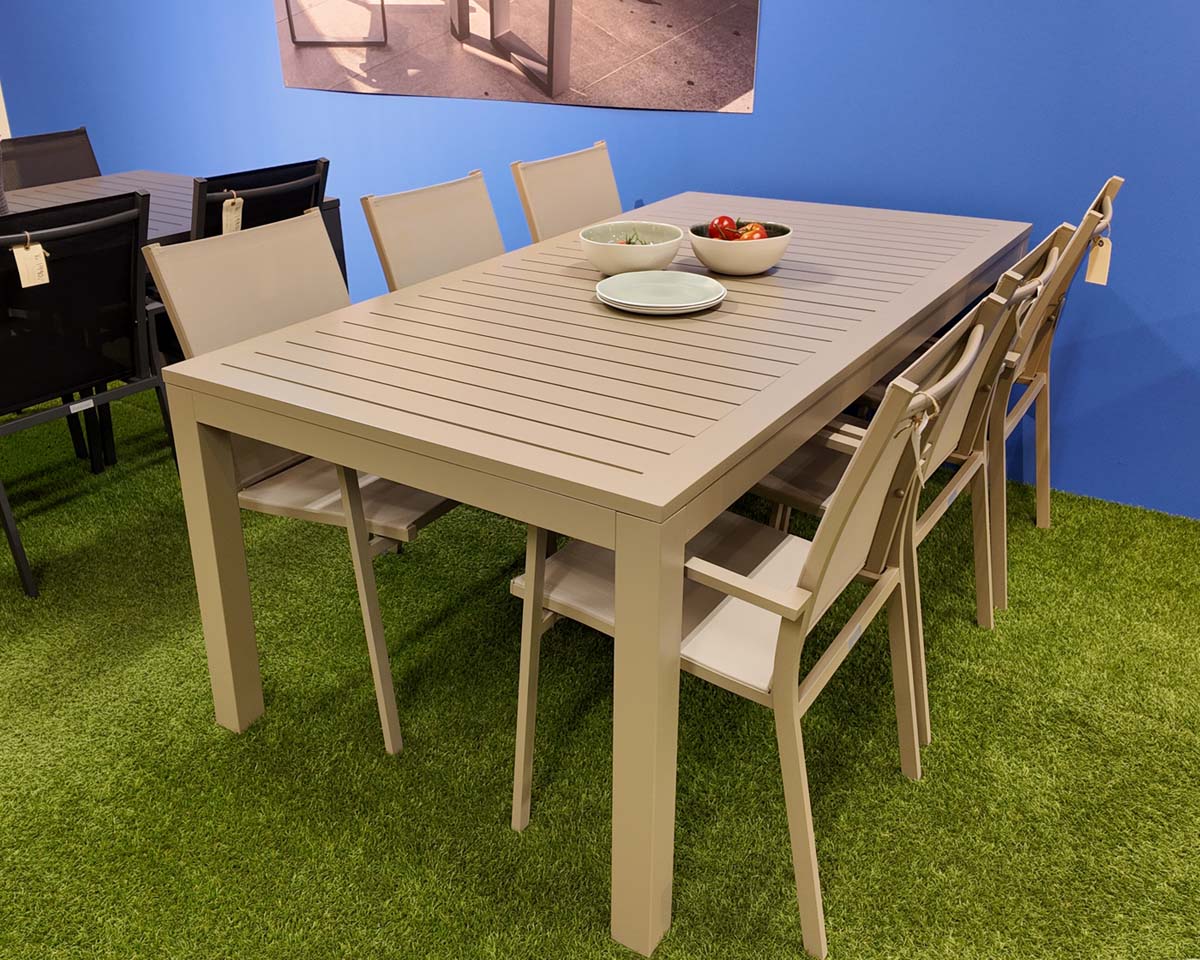 SALG: Gardenart beige spisebord med to ileggsplater og seks stablebare stoler. (100526kampanje) Pakkepris